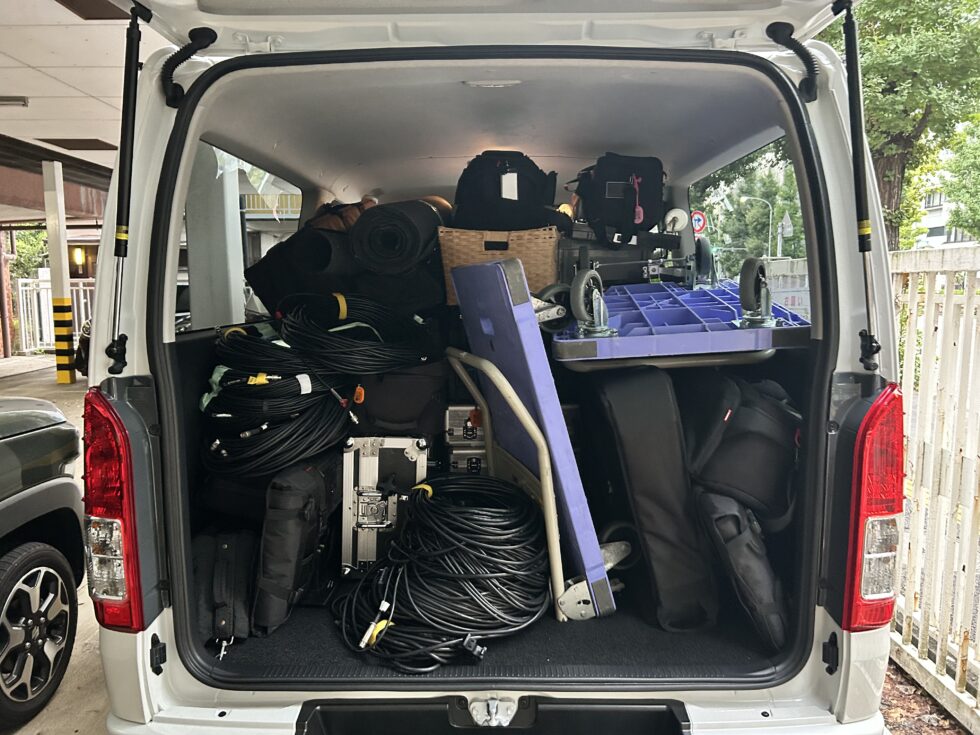 会場に到着後、ハイエースから機材を搬入し、ベース(スイッチャー側)と出先(カメラ側)に機材を振り分けて行きます。