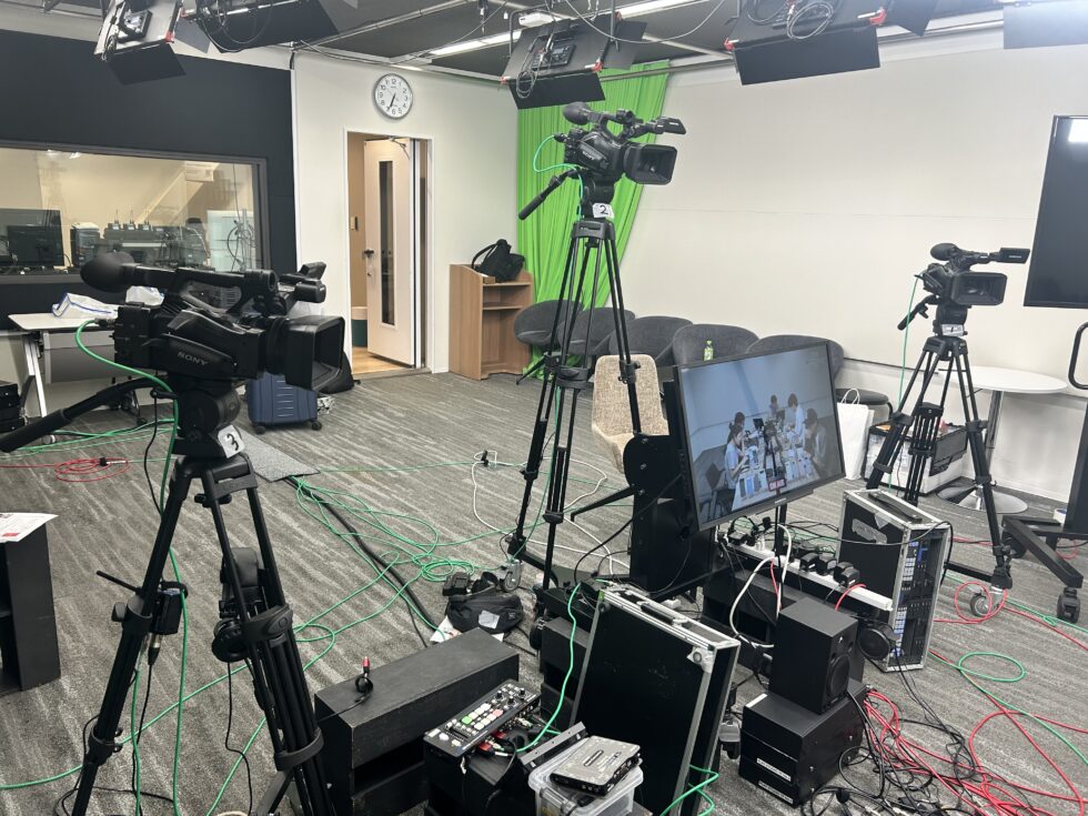 今回は仕込みと本番日合わせて計3日間行われ、初日は10:00に都内スタジオに集合して仕込みからスタートしました!仕込みは大まかに、カメラの設置、インカム、演者さん用のモニター10台の設置などを行いました。