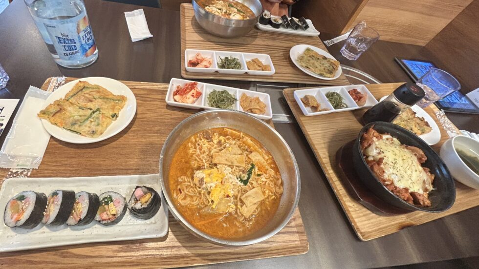 今回いただいたのは、お写真の通り!ラーメン、キンパ、チヂミ、そしてとろ〜りチーズがたまらないチーズダッカルビの豪華セットです✨