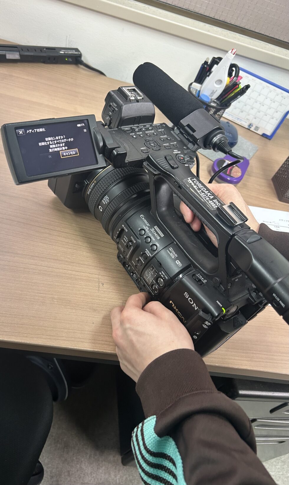 ロケに出る前に、まずはカメラの基本設定について簡単に説明を行いました。今回使用したのは業務用カメラであるSONY NX5Rです。