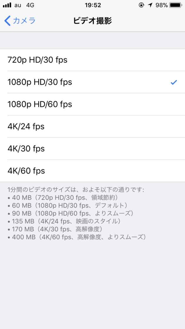 iPhone 8もしくはiPhone Xでカメラの設定からビデオという項目を選んで頂くと下記のような画面が表示されます。